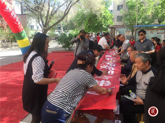 活动开始前,由第一书记宣布对评选出的十户“民族团结模范家庭”、“十户联防示范户”、“社区好居民”进行表彰奖励。之后,社区少数民族干部发声亮剑,号召少数民族群众“爱祖国、感党恩、听党话、跟党走”,远离暴恐极端势力,共建和谐美丽昌吉。“民族团结一家亲”签名活动,大家踊跃参与,将自己对民族团结的坚定信念记录在宣传条上。工作队长庄庆军带领大家面对国旗庄严宣读《中国公民宣誓词》,慷慨、激昂的声音在蓝天白云间久久回荡,表明各族人民维护祖国统一、维护民族团结的不屈信念……