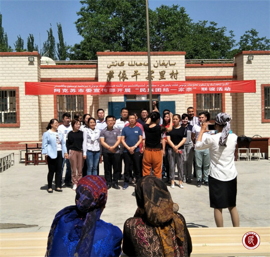 新疆民生网讯 (通讯员 曹青)近日,阿克苏市委宣传部的干部们与萨依干买里村的亲戚们开展了一场“民族团结一家亲”联谊活动。当天一大早,萨依干买里村的大院里就热闹非凡,村民们换上了干净漂亮的衣服陆续来到村委会,驻村工作队也忙前忙后,调试音响、摆桌子、挂横幅、烧开水。听说今天城里的亲戚要来看我们,大家非常高兴,动作也不由地加快起来。