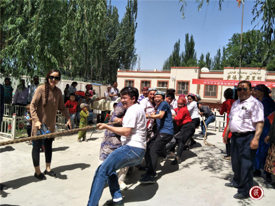 中午12点整,阿克苏市委宣传部“民族团结一家亲”联谊活动正式开始。活动第一项是听宣讲,由阿克苏市委讲师团的干部为村民朋友们讲解自治区党委九届二次全体(扩大)会议精神,赢得了大家拍手称赞。随后,欢快的音乐响起,宣传部的干部们和亲戚朋友们开始跳舞唱歌,大家有的转圈,有的拉手,有的扭脖子,气氛异常热闹。而此时的太阳正像个大火球挂在天空,晒得人汗珠往下直滚,却也丝毫没有击退大家热情的掌声和欢呼声。在接下来游戏环节中,干部们与结亲对象两两一组组成拔河队进行比赛,大家默契配合、你拉我拽,牺牲自己,在游戏中体验了团结一心的力量。伴随着欢声笑语,美味的抓饭出锅了,大家齐聚村委会文化活动室用餐,碰鸡蛋、举茶杯、喝酸奶,亲戚朋友们和干部们就像一家人一样温馨和睦。