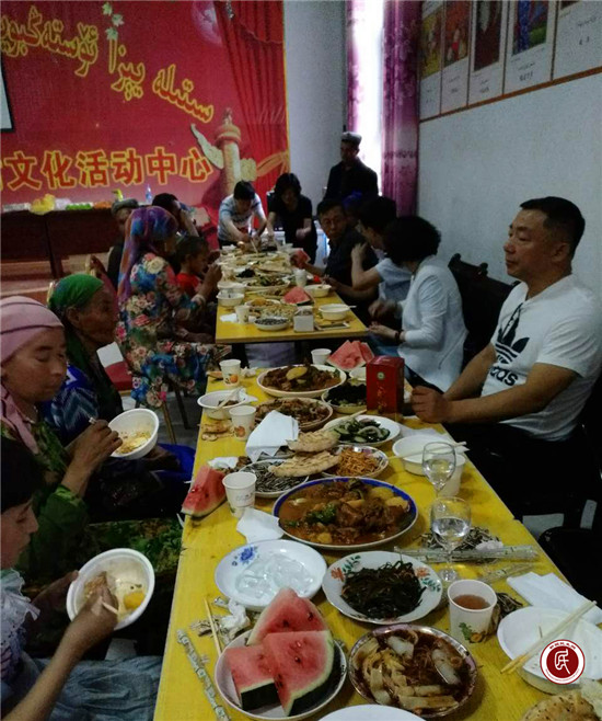 随后,驻村工作队精心为亲戚们准备的一桌桌丰盛大盘鸡、大锅抓饭、大块烤肉,大家围聚在一起,同坐一个长桌,同吃一锅抓饭,同饮一杯美酒,同尝一炉烤肉,伴随着热烈欢快的麦西来甫,边叙边吃话团结、边喝边跳拉家常、边唱边舞聊生活,共同感受各民族大家庭手足相亲、守望相助的深厚感情,共同品味民族团结一家亲的甜蜜果实,共同凝聚起建设大美和谐幸福新疆的强大力量。