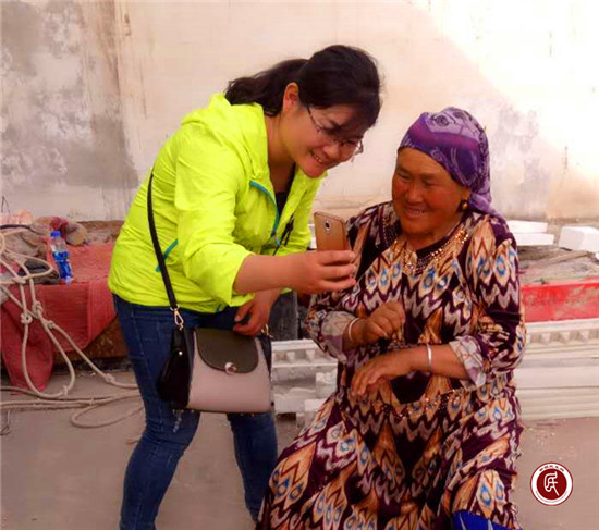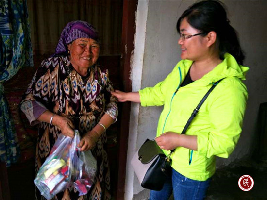 当我们赶往巴哈尔·阿合尼牙孜家时,只见她家的大门敞开着,在院子喊了大妈的名字后,我走进她家客厅,将手中礼品递给大妈,她高兴的接过物品,给了我一个热情的拥抱。还从冰箱拿出准备好的饮料执意要我们喝。我通过手机照片让她了解我的家庭成员情况。通过阿不都的翻译,我得知大妈的女儿女婿去阿拉尔建筑工地打工了,她的老伴艾麦尔·托合提去阿拉尔放羊,家里现在就她和外孙两人,外孙在大队幼儿园上学,她自己在家里种九亩地核桃、红枣和棉花,一年全家打工、放羊、种地可以收入3万多元。听到他们一家人努力生活,我很是欣慰,就向她讲了惠民政策,鼓励她要照顾好家,全家齐心过好日子才是最重要的。大妈也说今后日子会越来越好。离开时她依依不舍得送出家门很远。对此我心里很感动,心想下个月六一再来看看大妈和她小孙子。
