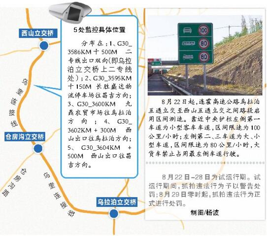 以上区间实施分车道限车型区间测速。也就是说靠近中央护栏左侧第一车道为小型客车车道,区间限速为100公里/小时;左侧第二、三车道为大、小型车道,区间限速为80公里/小时,大货车禁止占用最左侧车道行驶。8月22日-28日为试运行期。试运行期间,抓拍违法行为予以警告处罚;8月29日零时起,抓拍违法行为正式进行处罚。