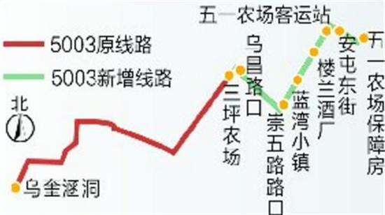 5003路由三坪农场三连延伸至五一农场保障房,其首末站由原乌奎涵洞至三连调整为乌奎涵洞至五一农场保障房。