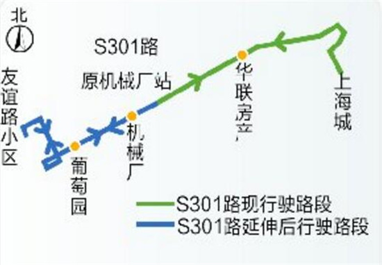S301路社区巴士公交线路延伸至友谊路小区。延伸后,S301路首末站由上海城至机械厂调整为由上海城至友谊路小区。