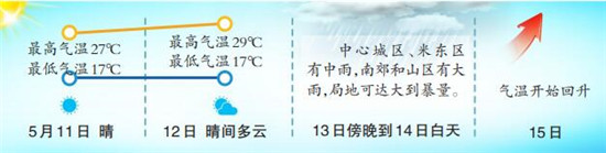 预计13日,中心城区天气为多云转小雨,最高气温27℃,最低气温8℃;14日小雨转多云,最高气温18℃,最低气温8℃。