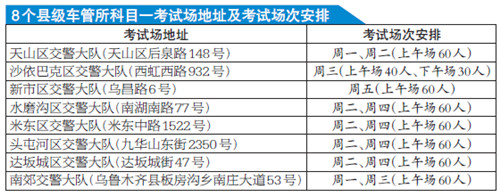 记者从市公安局交警支队车辆管理所了解到,当日起,首府天山区、沙依巴克区、高新区(新市区)、水磨沟区、米东区、经开区(头屯河区)、达坂城区及南郊共8个县级车管所正式开通驾考科目一考试业务。这也意味着,今后考科目一的考生不用再跑乌拉泊,可就近约考了。