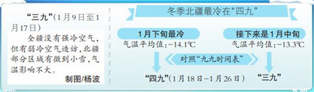 “三九”是不是北疆冬季最冷的时段?记者联系到新疆气候中心,发现最冷在1月下旬(气温平均值为-14.1℃),接下来是1月中旬(-13.3℃)。对照“九九时间表”,分别是“四九”和“三九”,也就是说,北疆最冷的时段是“四九”,“三九”紧随其后。