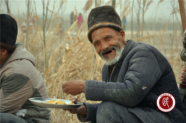 图9 接过工作组递上的抓饭,老爷爷开心地笑了