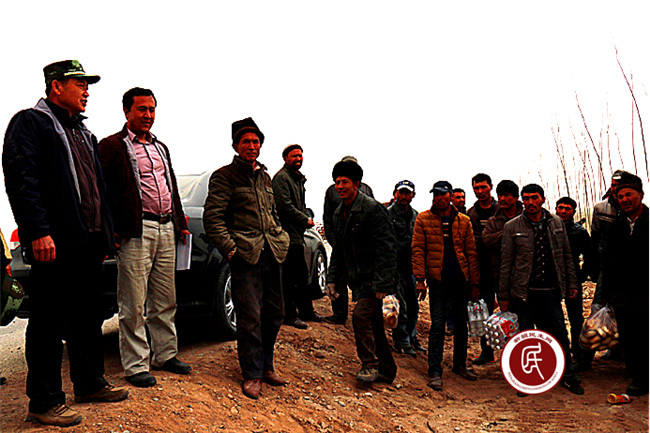 3月12日,英吉沙县弥漫着沙尘天气,漫天的黄沙阻挡不住自治区发改委住英吉沙县萨罕乡库如克铁热克村(19村)第三批工作组看望慰问植树村民和参与植树的脚步。住村工作组在萨罕乡库如克铁热克村(19村)村党支部书记买买提明·艾则木的陪同下,一同驱车60多公里,看望慰问在英吉沙县戈壁滩防风固沙林工地义务植树的村民,并一同植树。