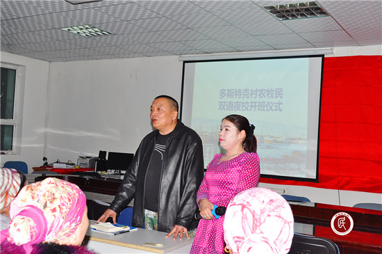 3月21日,多斯特克村“农牧民双语夜校”正式开班。在开班仪式上,冯亚希队长勉励村民学员好好学习双语,通过提高普通话水平,为下一步进行专业技能知识培训、为过上幸福富裕的生活打好基础。两个小时的“双语培训”课程很快结束了,村民学员听完课以后纷纷表示:感谢工作队为我们提供了这么好的学习机会,我们一定会好好学习双语,提高自身双语水平和专业技能,为建设美丽的多斯特克村的明天贡献自己的一份力!