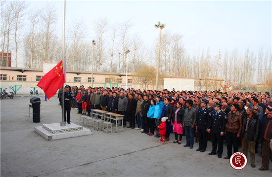 (图为阿山林管局驻阿克苏市阿依库勒镇阿克提坎村“访惠聚”工作队与村民一起参加升国旗)