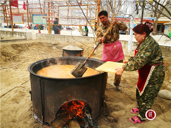 庆祝诺鲁孜节当然也少不了那一碗美味诱人的诺鲁孜粥。工作队队员们和村民早早就备好食材、燃起篝火,浓浓的果香、豆香混在一起,煮成了美味可口的诺鲁孜粥。大家同跳一支舞、同吃一锅饭,表达着对丰收的祈福和对来年美好生活的期盼。活动尾声,工作队为到场村民发放了T恤、床单、鞋子等节日礼物。