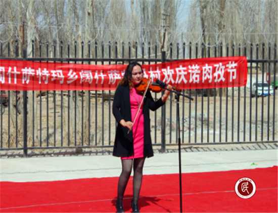 村里民间艺人们即兴弹奏的维吾族乐曲、维吾尔族女士声情并茂的诗歌朗诵引人入胜,开展文化下乡活动的县文体局的老师则表演了专业水平很高的小提琴独奏曲。一时间,台上节目异彩纷呈,台下观众掌声雷动,台上台下汇聚成了一片欢乐的海洋。