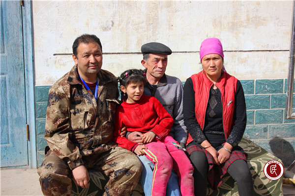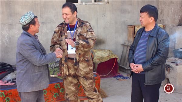 在依干其村入户走访中的米吉提•艾买提(中间)
