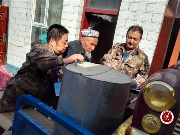 图为3月21日米吉提•艾买提(右1)在村里入户走访中帮艾买尔·依来克大叔搬家时的情景