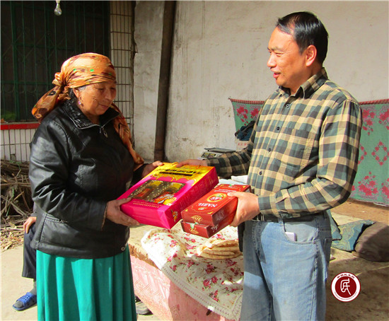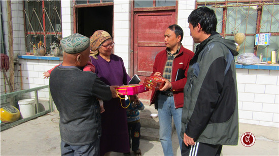 新疆民生网讯  3月24日,阿克苏市国税局驻托万科乔格塔勒村工作队一行4人,带着节日礼物来到村民托合体·卡迪尔家,来看望这位有着52年党龄的老党员,向他送去节日的问候。(3月21日是维吾尔族群众的传统—诺鲁孜节)。