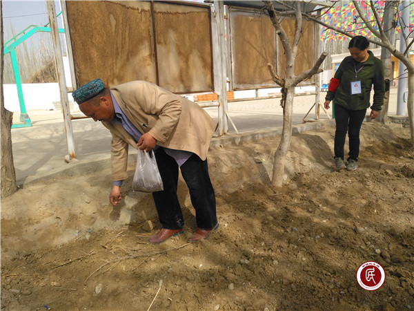 “美化庭院”活动是工作队在入户过程中萌生的一个想法。走村入巷时工作队发现村民们家里或大或小的空地,多是长着杂草或是闲置无物、覆着沙土,于是便在巴扎买了各类花种、菜种交由小队长分发给村民,号召大家利用闲置土地播种。据了解,这已不是工作队第一次开展美化活动,在21日的诺鲁孜节联欢活动上工作队也买了辣椒、小白菜、萝卜等菜种分发给村民。24日,工作队积极响应上级号召,带领村民在村周边植树1000多株。随着村内环境整治的持续推进,既达到了美化院落的目的也增强了村民的环保意识。