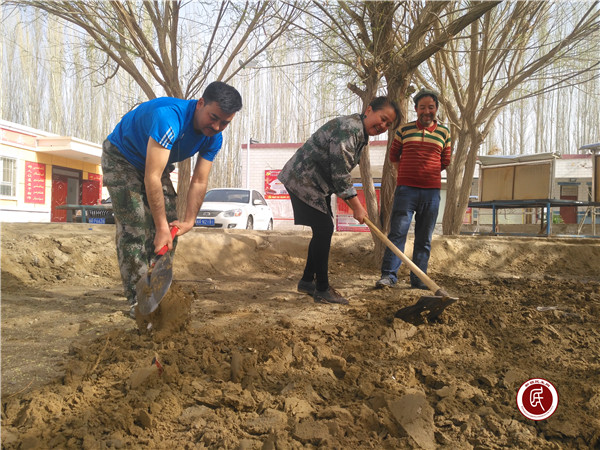新疆民生网讯 (通讯员 司原昌)为大力推进“美化庭院”活动,努力提升村内人居环境,3月26日,新疆师范高等专科学校(新疆教育学院)驻和田地区洛浦县山普鲁镇阿日买里村工作队因地制宜、模范带头,与村两委、寺管会及各级维稳力量齐聚在村委大院,一起植树栽花。