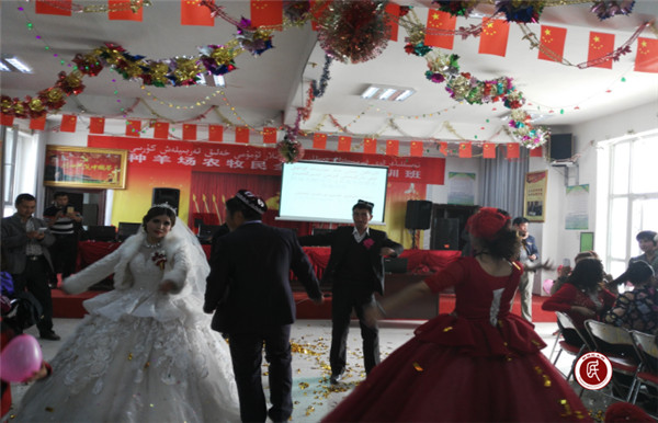 3月25日,在拜城县种羊场农业六队的村民服务中心,一场别开生面的现代婚礼在这里举行。在村“两委”班子和驻村工作队的努力帮助下,在场部领导的见证下,村里的维吾尔族姑娘阿孜古丽·司马义和拜城汉族小伙蒋军今天终于步入婚姻的殿堂,收获了幸福的爱情。