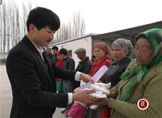 3月27日上午,拜城县文体广影局驻米吉克乡库木墩村工作队在组织完周一升国旗活动后,开展了工作队给孤寡老人送温暖,给低保户免费发放加碘盐活动。