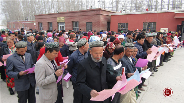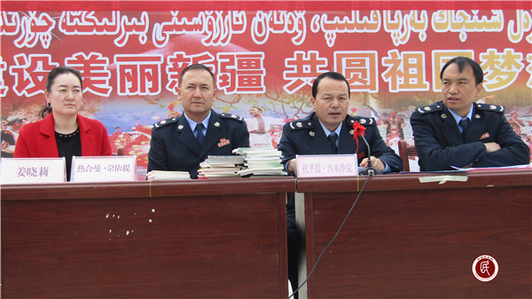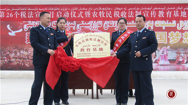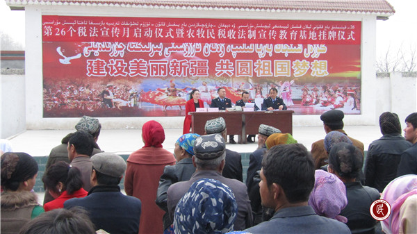 3月27日,来自阿克苏市国税局、地税局、市司法局的领导干部、阿克苏市国税局2017年驻村工作队和库木克什拉克村的全体村民一起为南疆首个农牧民税收法制宣传教育基地的正式启用举办了揭牌仪式。
