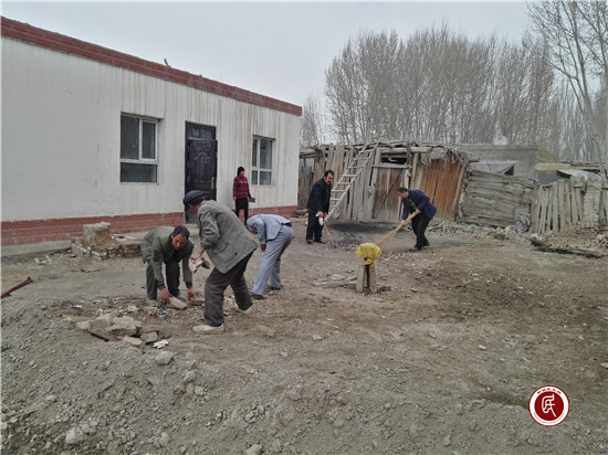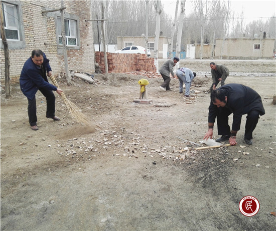 在喀迪尔·巴拉提老人家中,工作队与乡干部有人拿着扫把,有人直接撸起袖子用手从卧室到院子全都仔细清扫了一番。看着整齐干净的家,喀迪尔·巴拉提连声表示感谢。
