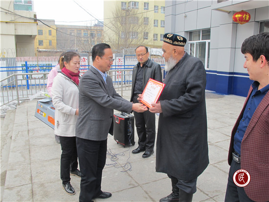 昌吉州人力资源和社会保障局驻奇台县奇台镇犁铧尖社区工作队组织社区全体干部、社区警务室民警以及辖区宗教人士、居民代表开展《致维吾尔族同胞觉醒书》大宣讲活动。宣讲后,社区表彰了互帮互助好邻里赛买提·伊敏和升国旗积极分子亚森·赫依提。(图2 昌吉州人力资源和社会保障局驻奇台县奇台镇犁铧尖社区工作队 刘靖)