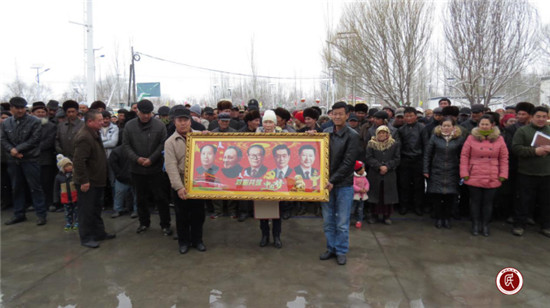 乌恰县波斯坦铁列克乡马热加尼库木村村民卡依热力·祖力甫哈尔在村民的簇拥下来到村委会,向马村村委会、“访惠聚”驻村工作队献上自己亲手绣制的牌匾--“同心共筑中国梦”,这幅极具意义的刺绣是卡依热力·祖力甫哈尔花了一年多时间一针一线绣刺的,她以自己的实际行动践行“五个认同”和“爱祖国、感党恩、听党话、跟党走”。