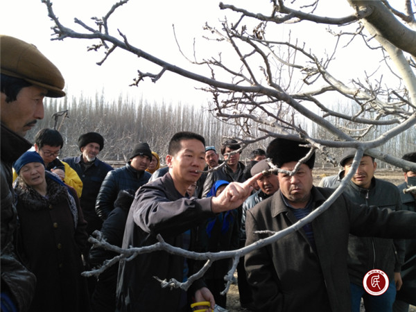 因正值春耕农忙,林业局的技术人员到村委会未休息片刻就直奔核桃地。在核桃地里,林业局周局长用一口流利的维语给大家讲授核桃树剪枝、病虫防治等技术。村民热情好问,生怕漏掉讲授的重点,紧紧靠着周局长。