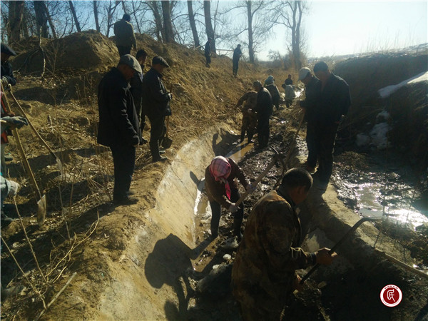 村民薛迎春开着自家挖掘机一早就按照既定的路线开始除冰,争取在山上的雪水大肆消融之前将各组主渠道进行清理疏通。村两委、工作队、各组党员同志都身先士卒的早早就对各分支渠道进行冰层的清理。渠道底部冰层厚实,进水后特别湿滑,一不小心就会滑到,但是他们没有一点点退缩与怨言,卖力的剁着、铲着、敲着,只为了能争取更多的时间,保护自己的家园。