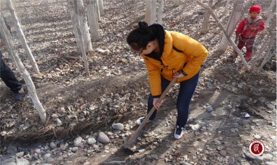 克州人社局驻阿克陶县玉麦乡加依铁热克村工作队队员李晓玲在清理水渠,为林地顺利灌溉清除障碍。