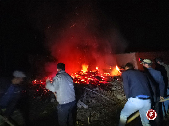 新疆民生网讯 (通讯员 周信、杜进姣)4月3日凌晨12:45,当大家都准备结束一天劳累的工作打算休息时,村委会大喇叭响了,大喇叭里传来了“一小队王汉寿家着火了,大家快去救火”的信号。阿克苏地区畜牧兽医局(畜牧技术推广中心、草原工作站)驻村工作队、村委会干部、协警立刻赶往火灾现场。到达火灾现场后,大家看到浓烟滚滚,熊熊大火肆虐的蔓延。驻村工作队队长艾尼瓦尔·艾则孜指挥着前来救火的干部和群众,你铲土压火、他提水盖火、你俩把未全部燃烧的木头从火堆中拉出来,你们三个建立防火隔离带......从附近陆续自发赶来的维吾尔族村民不断地投入救火行动。不一会儿,距离6公里外的村民也骑着摩托车赶了过来,共50余人参与了救火行动。在没有消防车的情况下,各级干部群众用简单的工具和双手不知疲倦地救火,在火光的映射下,每个人额头上的汗珠晶莹剔透,闪闪发光,却没有人停下来休息,他们要与大火赛跑,最大限度的减少经济损失,避免大火蔓延。经过近1个小时的并肩作战,大火被彻底扑灭。