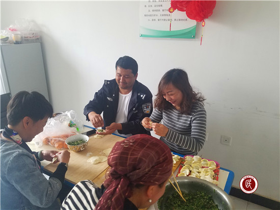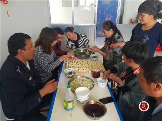 这不今天周末,一大早大家就分工合作,拔苜蓿、和面、剁肉为了一顿美食忙碌着,连“十指不沾阳春水”的民警、驻寺干部都兴致勃勃的加入到制作美食的队伍中,大家说说笑笑,谈工作、谈生活,周转宿舍食堂里充满着欢声笑语。