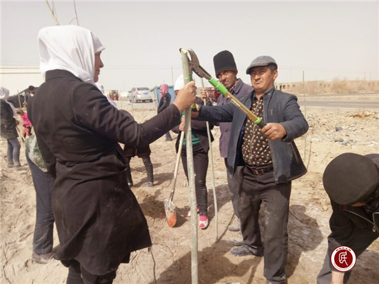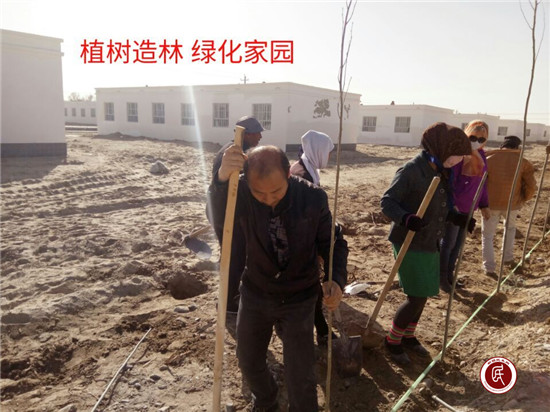 巴州奥依亚依拉克镇阿尔帕村牧民和驻村干部绿化家园植树忙