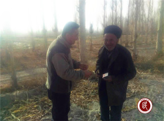 新疆民生网讯 (通讯员 霍学斌)3月16日下午,巴州住建局驻且末县阿热勒乡阿热勒村工作队队长陈志军接到了村贫困户阿布都热依木·依布拉依木老人家人打来的电话,说村里一苗圃工人在浇水灌溉时因不慎跑水,以致家中小麦条田受淹,经协商未果,需工作队进行调解。得知这一消息后,队长陈志军立即赶赴现场,细致了解了事件详细情况,查看了小麦受损程度,经耐心调解,苗圃工人最终同意当场支付老人350元小麦受损费用。当接过队长陈志军递来的350元钱时,老人万分激动:“感谢共产党帮助我解决了困难,共产党亚克西!”