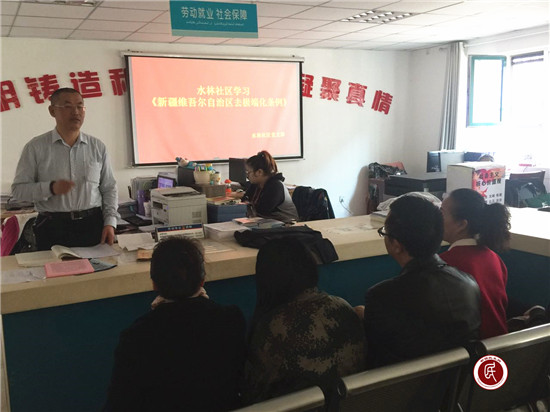 工作队队长姜波在驻社区之前是昌吉市委宣传部讲师团团长,剖析讲解党的理论方针政策是他的工作强项,知道自治区颁布实施《新疆维吾尔自治区去极端化条例》后,他深刻理解,这是从法治层面遏制和消除极端化、防范极端化侵害、实现社会稳定和长治久安的有效措施。