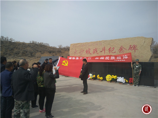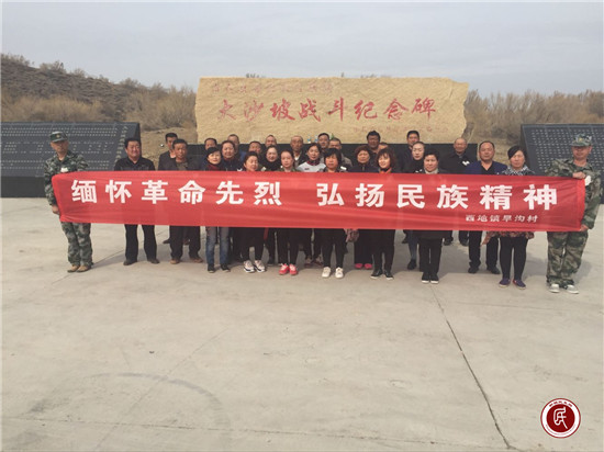 新疆民生网讯 (通讯员 雷星)2017年4月3日,旱沟村“两委”班子和奇台农场驻旱沟工作队联合组织清明节祭扫活动,此次参加活动的有党员、群众、村警和宗教人士,在大沙坡战斗遗址开展“缅怀革命先烈,弘扬民族精神”为主题的爱国主义教育活动,村“两委”和驻村工作队为纪念碑敬献花圈,全体人员肃立默哀向革命烈士们表达崇高的敬意,并且在纪念碑前宣誓。认真听取村书记讲解大沙坡战斗的历史经过,让大家铭记这一历史时刻,珍惜他们给我们换来的幸福生活。