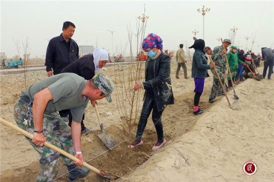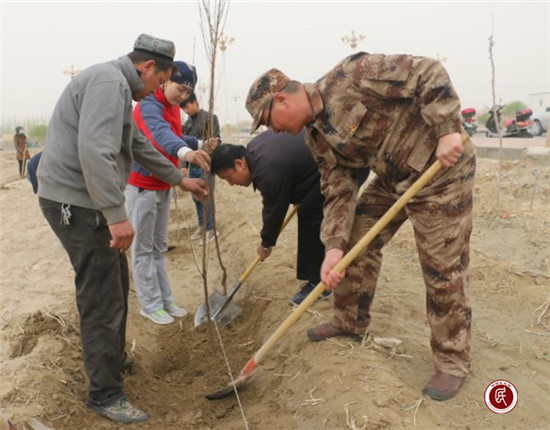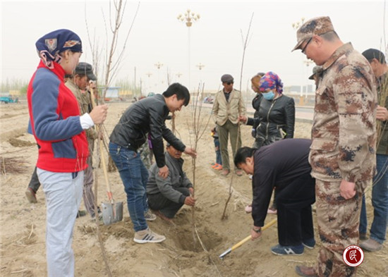 新疆民生网讯 (通讯员 王志耕)4月9日,二师“访惠聚”驻且末县奥依亚依拉克镇苏塘村工作队与村干部和少数民族群众一起忙碌,共同栽种桃树苗20亩,完成了驻村工作队精准扶贫种植“特色果树示范园”、引领带动村民发展庭院经济增加收入的又一个项目。