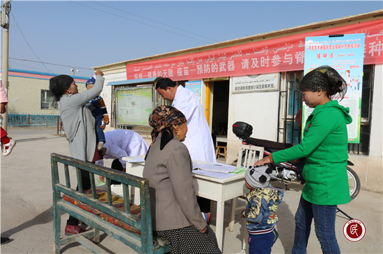 在此之前驻村工作队每逢周一升国旗、走访入户和村民大会等人员聚集期间大力宣传党的惠民政策、脊髓灰质炎强化免疫的重要性和脊髓灰质炎的危害。一位名叫阿依古丽的妇女说:“听驻村工作队和村干部说了脊髓灰质炎的危害和接种疫苗的好处,我们要积极配合,感谢国家的政策!感谢共产党!”