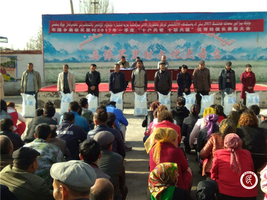 新疆民生网讯 (通讯员 阿尔祖古丽)为切实达到维稳事务共管、社会和谐共建的目标,更好开展村级工作,2017年4月10日上午,拜城县布隆乡奥依买里村召开“十户共管、十联共建”工作表彰会议,村“两委”班子、工作队员、“十户长”、村民共计560余人参加了会议。