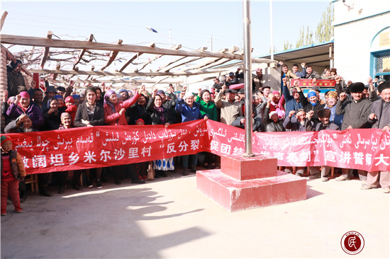 新疆民生网讯 (通讯员 夏振家)为深入贯彻落实各级党委相关决策部署,充分展现全村各族群众勇于发声,敢于亮剑,坚定同“三股势力”斗争到底的决心,4月10日,村委会、工作队组织村民积极参加“反分裂、促团结、发声亮剑”宣誓活动,全村636名村民参与宣誓。