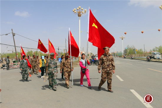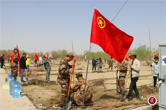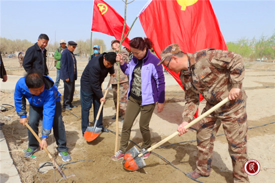 新疆民生网讯 (通讯员 王志耕) 4月10日,且末县奥依亚伊拉克镇、二师38团、驻且末县奥依亚伊拉克镇苏塘村工作队100多人,一大早就打着党旗、团旗、扛着铁锹来到苏塘村植树现场,开展了兵地共建民族团结林义务劳动活动。