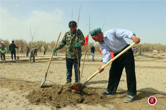 奥依亚伊拉克镇与兵团38团仅一路之隔,近年来兵地双双加大融合共建力度,把保护生态环境、共建美丽家园作为深化民族团结一家亲活动一项重要内容。二师驻苏塘村工作队驻村后,发现该镇紧邻315国道边的一片林子由于土地盐碱重、管理技术不到位,年年种树不见林,就主动与38团联系,请来团场林业技术人员现场诊断后,对林地土地进行了深翻、大灌处理,同时工作队队长程龙与镇、团场党委、团委、民兵组织磋商筹划,组织了“兵地携手栽植同心树 融合共建美丽新家园”义务种植民族团结林活动。在38团场、奥镇党团组织、驻村工作队的友好协作下,100多名兵地、工作队党员干部、团员、民兵、群众热情投入到共植民族团结林活动中来。