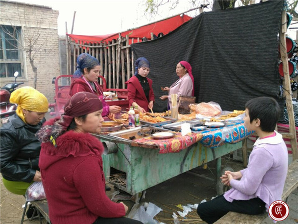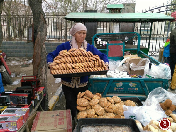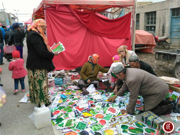 小镇的巴扎还很长,人也还很多,我就顺着拥挤的人群继续往里面走。可以看到路两边摆满了卖服装、卖糕点、卖头饰以及卖小吃的商贩,商品林林总总,数不胜数。但我发现今天的巴扎上卖的最多的商品应该是各种蔬菜、瓜果的种子。在种子摊位的旁边,挤满了维吾尔族群众,他们在精挑细选自己相中的种子。是啊!现在正是大地回春,春播秋收的大好时节,谁不想在春季播下希望的种子,在秋季收获沉甸甸的果实呢?我们也是在春季来到赛里木镇拉帕村的,我们和村民沟通交流交心交朋友,希望播撒团结的种子,收获像石榴籽一样甜甜的硕果!
