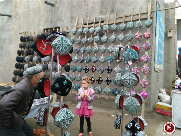 巴扎是以一条马路为中间通道,在路的两边满是商家。右手第一家就是卖维吾尔族小花帽的,各式各样的维吾尔族小花帽挂满了整整一面墙,真的非常好看。维吾尔族小花帽是维吾尔族人最喜欢的饰品之一,也是维尔族朋友给尊贵的客人敬献的最好的礼物之一。去年我与热合曼大哥结亲时,他就送我了一顶小花帽,我把它放在家中显眼的位置上,时不时地儿子也会拿起小花帽戴上,顽皮地问我帅不帅?我总会认真地告诉他,非常好看。因为这顶小花帽将原本陌生、相隔千里的我们和热合曼大哥一家人紧紧地联系在了一起,相互牵挂,彼此关心,就像一家人一样。但其实我们真不陌生,我们共同生活在中华大家庭中,根本就是一家人!