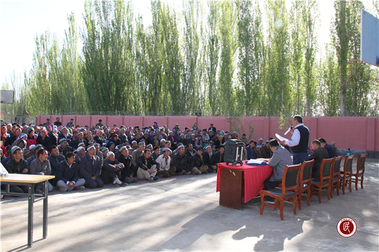 首先,依玛木队长宣读了喀什地委副书记、纪委书记牙生·司地克书写的《勇敢站出来!向“三股势力”全面宣战》,对“三股势力”的邪恶本质进行了发声亮剑。广大维吾尔族干部群众要坚决拥护中国共产党的领导,维护民族团结和稳定,毫不犹豫、毫不留情地检举揭发涉恐涉暴线索,同暴力恐怖分子做不屈不挠的斗争,珍惜当下和平稳定、幸福安宁的美好生活。随后对艾力西湖镇15村原支部书记麦麦提托合提·柔则违纪违法问题进行了通报。麦麦提托合提·柔则丧失党性胆大妄为,违纪违法操纵选举,并利用职务便利,中饱私囊,侵害了群众利益,严重损害了党在群众心目中的形象。同时,其暗地里与“三股势力”狼狈为奸,宗教极端思想浓厚,是隐藏在基层的极其危险的“两面人”,是不折不扣的乡村“毒瘤”。对其依法处理,彰显了我们党在整治干部作风、治理侵害群众利益问题的坚强决心,任何“两面人”干部,企图分裂祖国的行径、欺压百姓的行为,妄图破坏这来之不易的幸福生活,都必将受到法律正义的制裁。我们党坚决要把所有“两面人”干部挖出来、打干净,切实维护村民自身利益不受侵害。