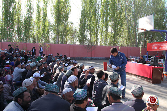 新疆民生网讯 (通讯员 闫东花)周一升国旗已成为托万木尕勒(5)村进行大宣讲常态化的一个重要途径。4月10日,举行完升国旗、《我是中国公民》宣誓活动后,5村工作队队长、第一书记依玛木·苏甫进行了一次别开生面的宣讲。