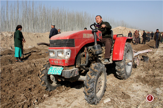 田间,工作队、村干部、青年志愿者,有的卖力的挥起坎土曼,有的驾驶拖拉机,到处是一派春耕备耕的繁忙景象。