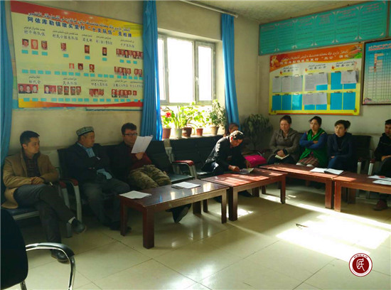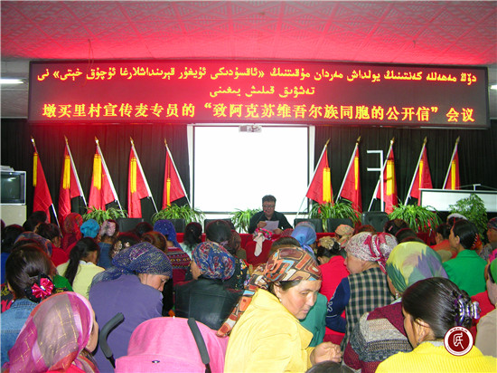 新疆民生网讯 (通讯员 李媚)4月12日,阿克苏市政府办驻阿依库勒镇墩买里村工作队队长艾尼瓦尔·尤努斯主持宣讲了地区行署麦尔丹·木盖提专员的《致阿克苏维吾尔族同胞的公开信》。一是明确目标。组织群众认真学习了麦尔丹·木盖提同志坚定政治立场,强烈的爱国热情、务实的工作作风、真情的民族感情、鲜明的是非标准、质朴的为民情怀。二是突出重点,驻村干部、村干部、驻寺干部、村警采取了集中学习的方式,逐句反复学习了《致维吾尔族同胞公开信》,增强了全体党员向麦尔丹·木盖提同志学习的思想和行动自觉。三是逐户宣讲。市政府办驻阿依库勒镇墩买里村工作队队员入户走访向广大群众宣讲麦尔丹·木盖提同志《致维吾尔族同胞公开信》,引导广大群众自觉向麦尔丹·木盖提同志学习。四是发声亮剑。市政府办驻墩买里村工作队积极组织村两委班子成员、各支队伍的党员干部主动揭批“三股势力”的罪恶本质,发出了对中国共产党、对伟大祖国的感恩之声,对国家和人民的忠诚之声,坚决与“三股势力”作斗争的正义之声。通过此次宣讲对深入推进“访惠聚”驻村工作、争取凝聚人心、宣传教育群众、促进社会和谐稳定具有十分重要的意义。