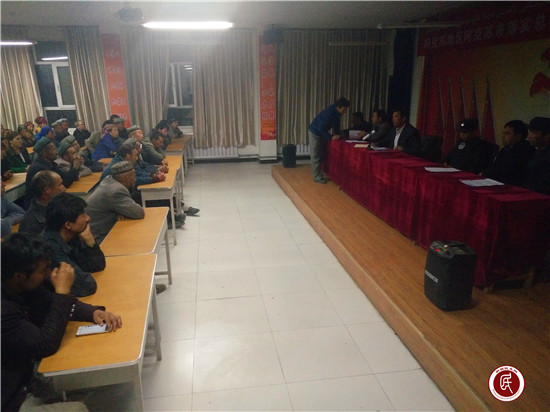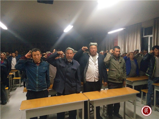 学习采取台上台下互动讨论、谈建议、谈受益、谈感受、谈做法、谈体会、谈心得的方式进行,短短两小时的学习会议不知不觉在村民积极、热烈、投入的氛围中足足延迟了近一个小时,全体村民尽然丝毫没有感觉疲惫。在这一刻,全体村民集体宣誓发声亮剑:为保卫自己的幸福家园,誓死与“三股势力”作斗争!